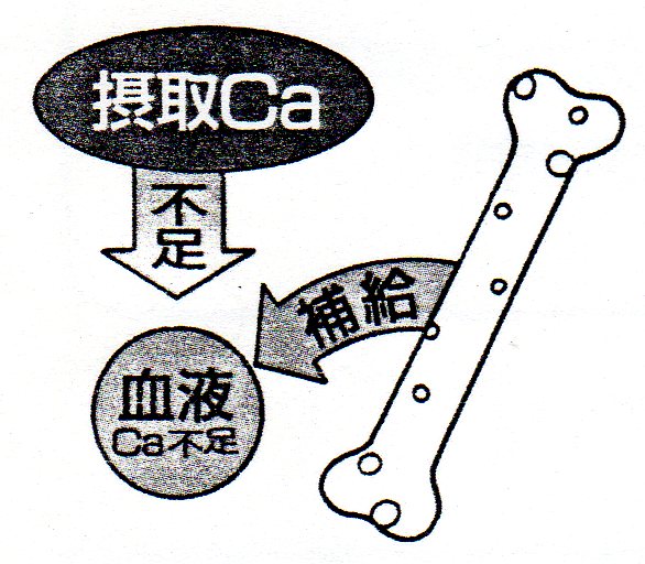 もし、生理機能を司る重要なカルシウムが血中に不足してくると、骨の中のカルシウムが溶け、血液中に補給されますので、骨がスカスカになってしまうのです。特に女性は更年期になるとホルモンのバランスの関係でカルシウムが抜け易くなります