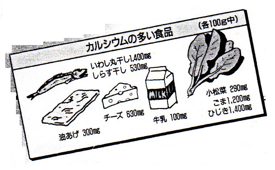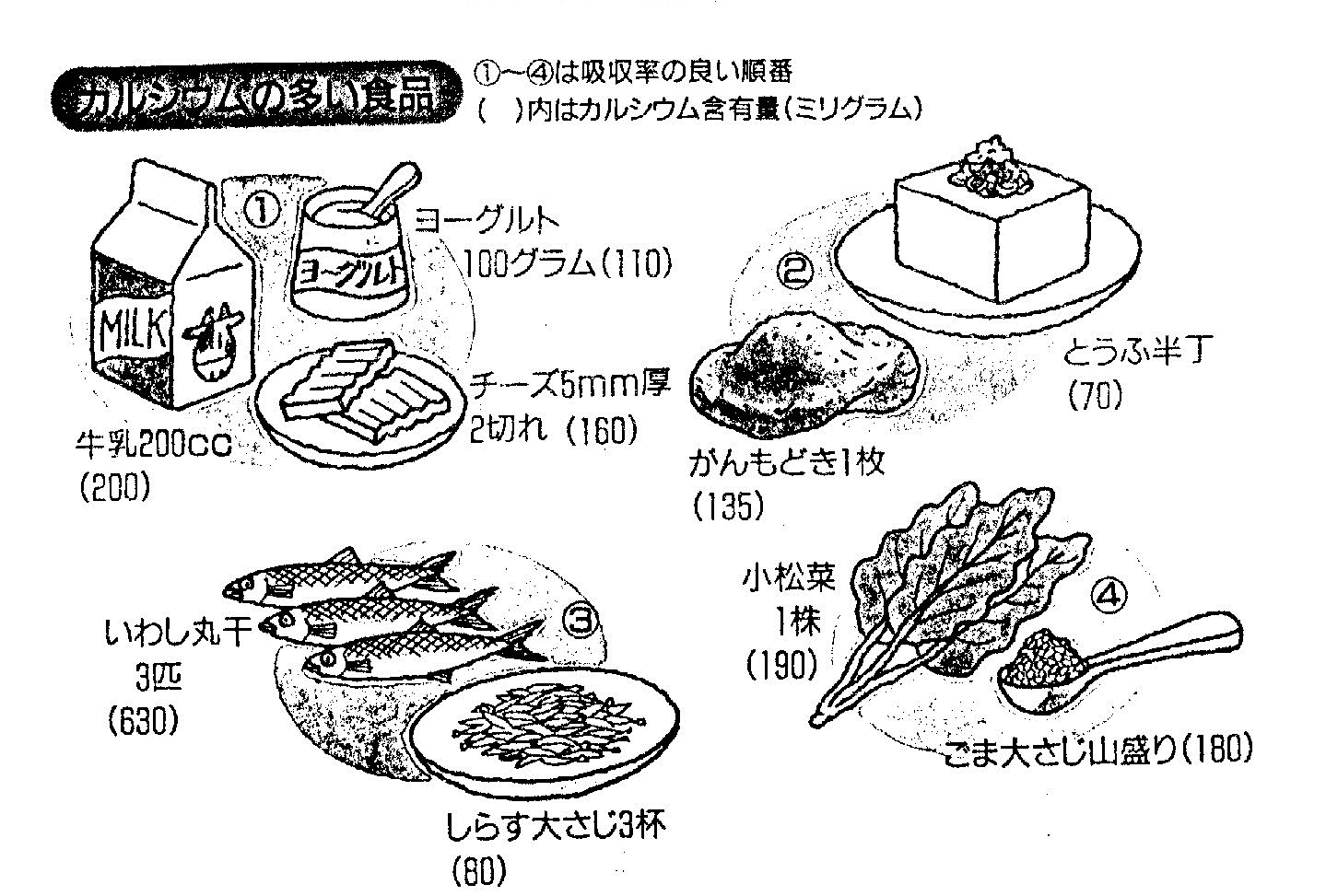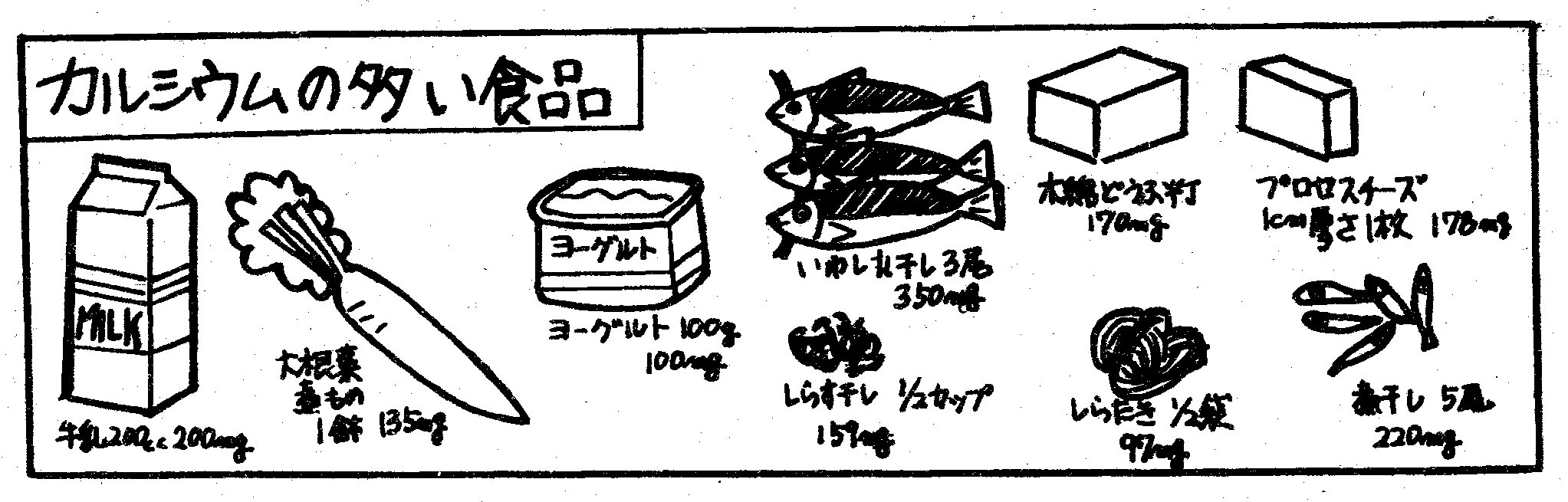カルシウムは一日600mgとることを目安に、牛乳、小魚、小松菜などの緑黄色野菜、大豆や大豆製品など、含有量の多い食品を積極的に食べるようにして下さい。
