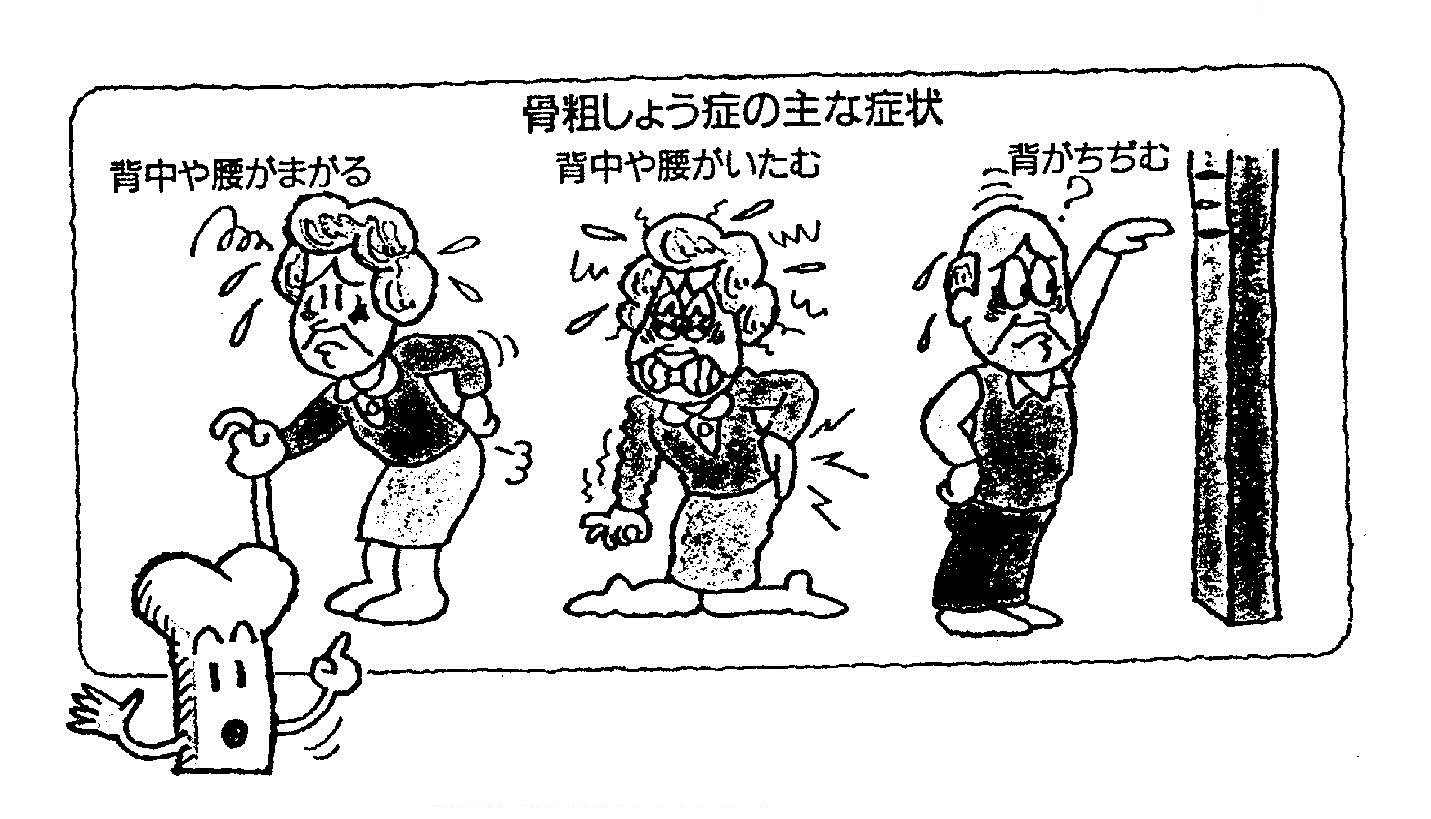 骨を弱くする骨粗鬆症とは・・・骨は加齢とともに弱くなる傾向を示しますが、日常の生活にも支障をきたすほどまで弱くなったのが、骨粗鬆症です。骨粗鬆症は閉経後の女性がかかる率が高く60才を過ぎると急激に増加して行きます。骨粗鬆症では、腰や背中の骨に早くしかも著しい症状が現れます。ですから背骨や腰骨が漏れるため、1、身長が低くなる。2、背中が丸くなる。3、腰背痛が生じる。などの3つの特徴的な症状を示します。