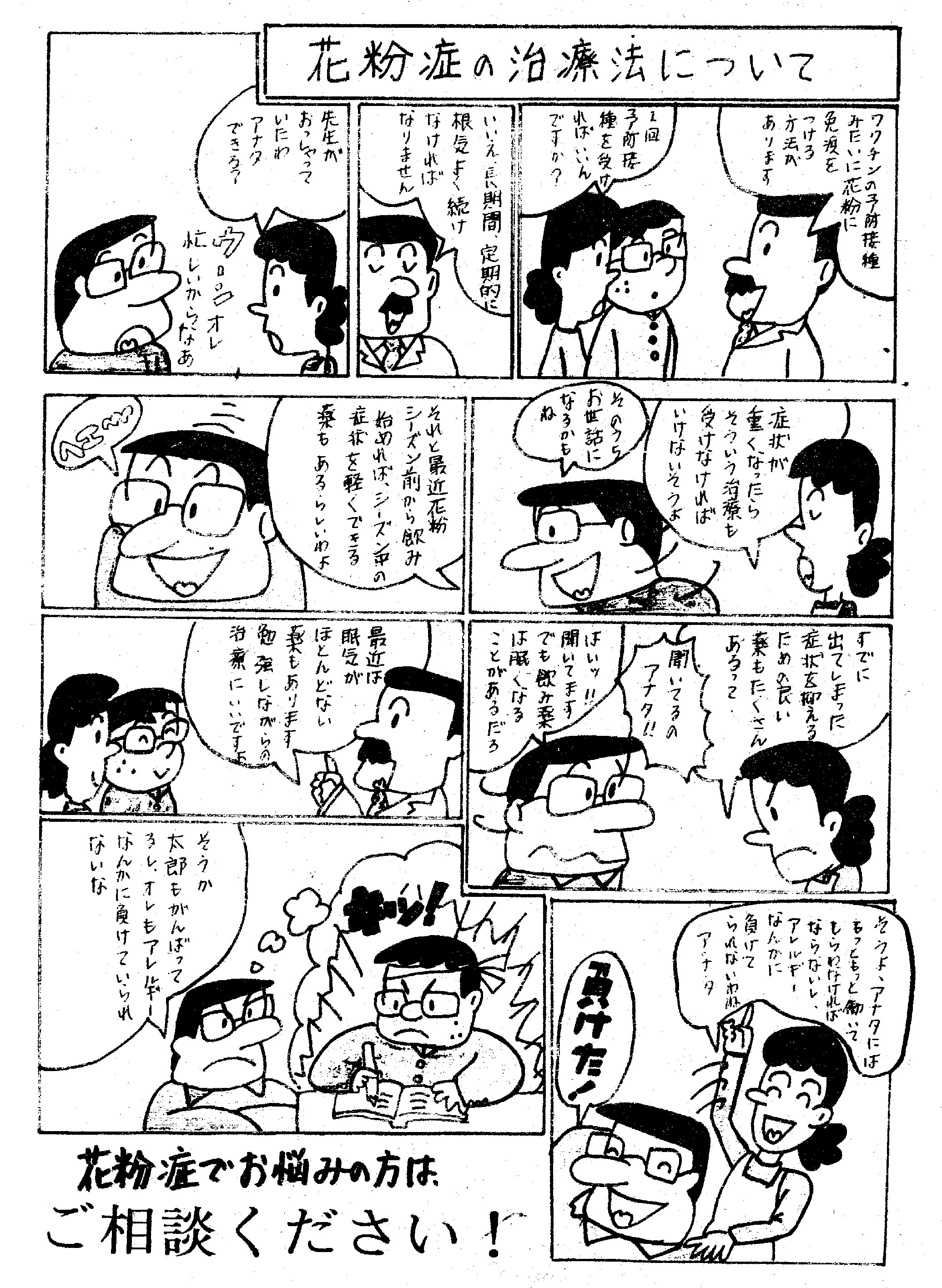 花粉症はもとより抗アレルギー薬や医療用の点鼻薬についての相談はお近くの医院で御相談されて下さい。市販薬・漢方薬以外については薬局に相談に来られた場合には医療機関を紹介いたします。