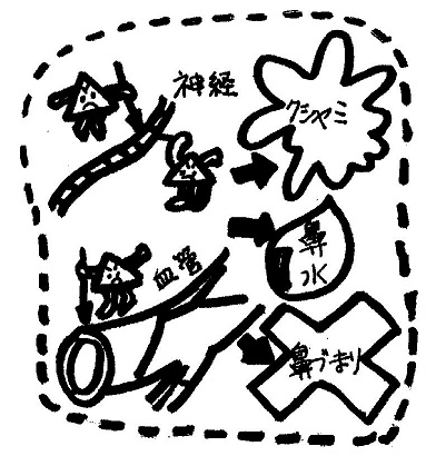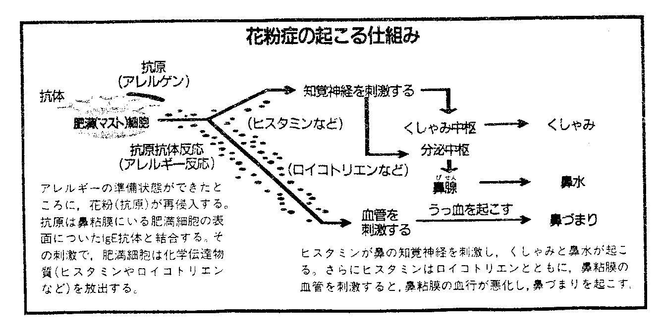 「花粉症の時期」と聞いただけでくしゃみや鼻がズルズルしてくる方はいませんか?花粉症の方にとってはとてもつらくていやな季節となりました。 さて今回、花粉症の症状と予防について簡単に整理してみました。 花粉症はアレルギー性鼻炎お一種です。くしゃみや鼻水、鼻詰まりを特徴とするアレルギー反応のⅠ型と言われるものです。本来、花粉を吸い込んだ場合、生体の防御反応でくしゃみで吹く飛ばしたり、鼻水で洗い流したり、鼻詰まりで侵入を防いだりします。人間にとって、この症状は自然で決して悪い反応ではありません。ところがある特定の人にとっては病的な反応を示す事があります。これをアレルギー反応と言います。花粉に敏感な人は図に示す様なアレルギー反応を示します。