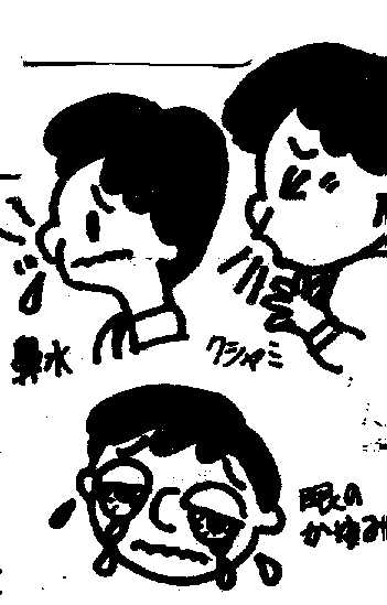 目のまわりが痒くなったり腫れ上がったり、又鼻の場合にはくしゃみ、鼻水、鼻づまりなどです。時に症状が喉の痛みや咳、頭痛などにおよび全身症状にいたることもあります。風邪を引いたと思って薬を服用いたけれどいっこうに症状が改善しないといった場合があります。これから春先にかけて、目や鼻の症状が酷い時には花粉症を疑ってみられるとよいでしょう。花粉症の場合、発熱症状は殆どでることはありません。鼻水は無色で透明であることが殆どです。
