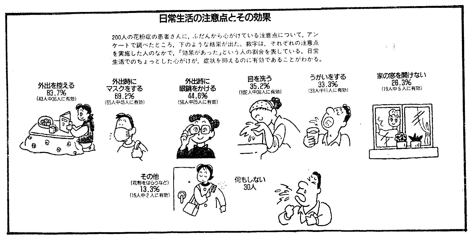 ⑤さまざまな花粉防止用マスクが薬局などで市販されています。この着用によって、花粉の収入量を80~90%カットできることがわかっています。普通の感冒用のマスクでも約50%吸入量を減らすことができます。