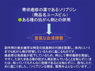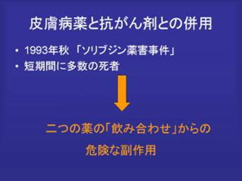 では本題に入ります。 これは十数年前の新聞記事の切り抜きを撮ったものです。 ちょっとショッキングなタイトルになっています。 抗がん剤との併用で副作用死亡14名。 抗がん剤と帯状疱疹で使う薬、ウィルスをた たく薬で、新しく飲みやすくした薬が十数年前に発売されました。この薬との飲み合わせで血液中の抗癌剤の濃度が高くなり、薬が効きすぎ血液障害をおこし、ご不幸にも14名の方がお亡くなりになられたという内容です。 今までは、薬というのは、Aという薬の副作用、Bという薬の副作用というのはありました。キノホルムやサリドマイドとかの特定のお薬の重篤な副作用の報告はありました。 これが初めて新聞紙上でAとBとのお互いの相互作用による副作用という形で話題になりました。 これ以降、お薬の飲み合わせについて、病院医療関係者はもちろんのことですが、一般の方々にも非常に関心が高くなって来ていますので、この新聞記事をご覧に頂きました。 詳しい話はなかなか判りづらいかとも思います。 要するに皮膚病に使われる薬と抗がん剤との併用で死亡者がでた。短期間で多くの死亡者が出たというので、この薬はすぐ製造中止になりました。 この新薬が発売された当初、添付文書には、この薬の説明には、特定の抗がん剤と併用はしてはいけません。「禁忌」=使っちゃいけません、と言う注意事項にきちんと書いてありました。ところが、医療機関側が十分に知らずに使った、あるいは抗癌剤をもらっている患者さんが別の医療機関で皮膚科を受診して投与された。