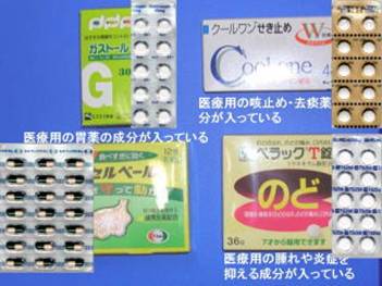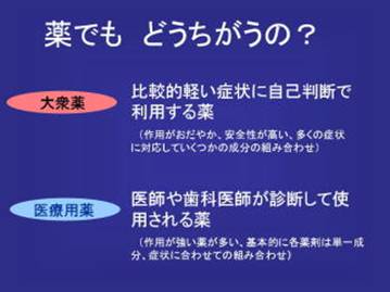 以前は市販の膀胱炎の薬でナリジクス酸というのがありましたが今年の4月から薬事法が改正になって、抗生物質に相当する薬は病院でしか出せないということになりました。 現金で買うことのできない薬です。 のどの腫れや炎症を抑える、痰の切れ、咳を鎮めるなど、先ほどコルゲンコーワかぜ薬で見ましたようにコルゲンかぜ薬を飲めばその中にのどの薬、痰の薬、咳止めやいろんな薬が入っていると申しました。 病院の薬の中には、 おのおの錠剤カプセルの中には抗生物質、のどの腫れを鎮める薬など単一の成分しか入っていません、基本的には。 中には医療用の薬といってもPL顆粒のような物は特別です。 風邪をひいたときトローチや嗽薬、漢方薬などと一緒にもらう白い粉薬ですね。 基本的には医療用の薬はカプセル、錠剤おのおの1種類の薬しか入っていません。 その成分の組み合わせでその患者さんに応じて処方しようということです。 市販の薬が既製品だとすれば、医療用のお薬はオーダーメイド。 その患者さんのサイズを測りニーズを聞いて薬をお作りしようというものです。 医師の診断のもと比較的作用の強い薬が処方されます。 中には市販の薬で使われているものもありますが、現在病院で利用される薬は作用が強いのが特徴です。市販の薬と比べて、、。 まとめになります。 大衆市販薬というのは、比較的軽い症状に自己判断で利用する。 ご自分で薬局薬店で求めて利用できるもの。 もちろん相談して求めるに越したことはありません。 作用が穏やかで安全性が高い。 とはいっても副作用がでることもありますので、もし万が一いつもと違った気になる症状の時は服用を中止しすぐご購入先の薬局・薬店にご相談ください。 医療用の薬、医師、歯科医師が診断して処方する薬。作用の強い薬。各薬剤は単一成分です。症状にあわせて処方される。 以上市販の薬と医療用薬はこう違うのだということをご理解していただけたでしょうか?
