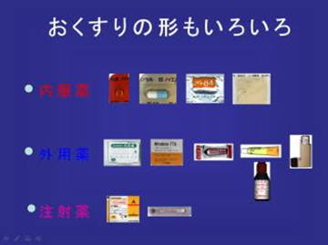 ではお薬の形にもいろいろありますということを申し上げます。今日は盛り沢山の内容になります。眠くなるかも判りませんが、しっかりお聴きください。 お薬もいろんな形があります。 先ほどは内服薬を中心にイラスト、写真をご覧にいれました錠剤やカプセル、先ほどは出てきませんでしたが、漢方薬、胃薬の粉薬、顆粒は内服薬ですね、外用には、シップ薬、心臓の貼り薬、女性のホルモン剤の貼り薬もあります。 呼吸を楽にする貼り薬もあります。痛みを止めたり、熱を下げたりする坐薬、かゆみをとめる軟膏や、呼吸を楽にする吸入薬。 吸入剤もいろんな種類があります。 予防的に使うお薬から、発作がきたときだけ吸入する薬などがありますので使い方を理解した上で利用して頂きたいものです。 それから注射薬、インシュリン注射です。今まではカートリッジの中に挿入して使われていましたが、最近は使い捨てが多いですね。自分で何単位とコチコチまわして使う、なくなったら新しいのと交換する。非常に便利がよくなってきています。 もう少し詳しくご説明いたします。 内服薬というのは口から服用する、食べ物と同じようなものです。 食べ物は口から入って食道を通って胃で細かく吸収されやすい形になって吸収される。 もちろんその中には消化液とか唾液とか各種消化酵素が関与し、消化を助けます。