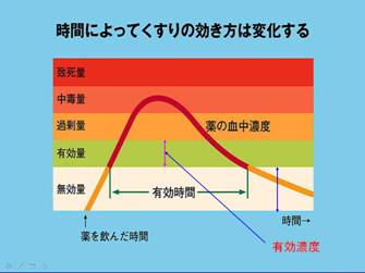 薬を飲むとしだいに血液中に吸収され血液中に分布します。 量が少なかった無効量から少しずつ血液中濃度が高まって、有効量、お薬の効果を発揮する量になります。 ところが、本来1日3回、1回1カプセルの飲むべきところを1回3カプセル、1日3回飲んだとします。薬の血液中の濃度は、3倍のんだから3倍になるとは限りません。ものによってはそれ以上に上ることもあります。 有効量を超えて中毒域に達します。 そうすると副作用や重篤な症状が現れてきます。
