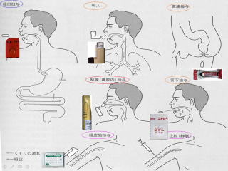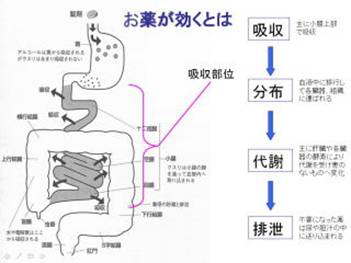 それから高齢者に出やすい副作用です。 どうして高齢者に副作用が出やすいか。 最初に薬の種類が増えるほど副作用が出やすいということを申し上げましたが、もちろんそれだけではありません。 お薬も同じで、口から食道を通って胃の中で細かくされ小腸の上部で吸収されます。 吸入薬であれば、呼吸することで肺に到達し肺で吸収されます。 坐薬であれば、直腸で吸収され肝臓で代謝されずに全身の血液に入ります。 点鼻薬であれば、鼻腔内で、ニトロは舌の下で吸収されます。 この内服薬は経口薬として服用すると効果が出て来ませんから、舌の下で咥えたり、唾液で溶かしたりすると、発作時に胸の苦しみを止めます。貼り薬、直接的な効果です。貼り薬、外用といっても全身的な作用をする、気管支を広げる薬もあります。シップだけでなく、薬によっては、効果が局所的なものから、全身に及ぶものもあります。 薬が効くとはどういうことかということです。 内服で説明しましたが、錠剤、顆粒、カプセルを服用すると、胃で吸収されやすく小さく砕かれ小腸の上部で吸収されやすい形にされます。胃で吸収されるものはそう多くはありません。 アルコールは胃で吸収されることが多いけれど普通のお薬は小腸の上部で吸収されます。吸収されたものは、全身の血液に入り行き渡ります。 もちろん肝臓で代謝され、代謝されることで効果が発揮されるものもあれば、代謝によって効果がなくなって腎臓で排泄されるというお薬もあります。 吸収されて全身に行き渡り代謝されて不要になったものは腎臓から排泄されます。 本来体の中でお薬は異物になります。 ビタミンなど 天然のものは別にして、外から入ってくるものは体の中にはないものですから自然に無毒化されて、普通は代謝されて排泄される形に基本的にはなっています。 お薬を服用した場合、効果がどういう風にして発現するかというお話です。