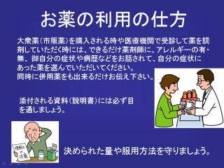 内用薬と外用薬とは別に保管しましょう。 殺虫剤や、防虫剤は別に置きましょう。 薬以外のものと区別して置きましょう。 坐薬はこれから気温が高くなるので、あるいは水薬、咳止めとか、水薬は気温が高くなってくると、中にシロップ剤が入っていて、非常に細菌の繁殖が高温と共に増えてくる可能性が高くなってくるので、冷蔵庫に保管してください。 頂いたお薬はなるべく、たとえば2週間で飲むお薬は、2週間で飲むように。 勿論飲み残しはあるわけで、毎食後飲むお薬を、お昼、ちょっと忘れて、急に何かを思い出して、外出して忘れていたということはあります。 そういった時は、前の薬、から飲んで頂きたいのです、お薬が変わらないときは。ただ、お薬が変わったときは、昔の薬を思いだして、この説明の資料があるからと、自分勝手に飲もうというのはいけません。 今出ているお薬をキチンとのんで頂きたいのです。 それから、症状が似ているからといって、他のひとの薬を飲むのは止めましょう。たとえば睡眠剤を、わたしにはいいから、あなた、どうぞとか。 人からもらったお薬をのんでみようというのはなるべく止めてください。 心臓の貼り薬を頭痛にいいからと頂いたという話しもあります。 そういった正しくない使い方は止めていただくようお願いします。 薬局でお薬をお渡しするときに、シップ薬が何種類か出ていることがあります。 患者さん同士でシップ薬の交換があります。 ご自分に出ている薬はご自分の薬です。 どうしても自分が使わない薬は、使いませんということを、医療費節減、無駄をなくすという意味を含めて病院におっしゃってください。 また、残っているお薬があれば、残っていますので、今回はいりませんとおっしゃってください。 お薬の利用の仕方です。 最初に医療用のお薬と市販のお薬との違いを理解していただきたいと申し上げましたが、理解していただくと同時にどんな利用のしかたをしたらよろしいか、基本的な考えだけをのべさせていただきます。 比較的軽い症状で用いるのが市販薬、病院にかかるほどではない、ちょっとした軽い症状の時利用するのが市販薬、大衆薬。 ちょっとおなかが痛いというときの正露丸、胃薬、風邪薬など。 ただしそういった薬をつかっても症状が、3日、5日、長くても1週間改善しないときは、病院に相談して診断を受けてください。