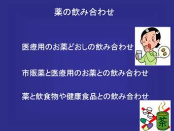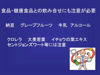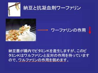 食後過血糖を改善しようというお薬、この薬をのんでいるお方が、一緒に消化剤をのむと、一方では消化吸収を遅らせようと、酵素を阻害します。 片方では消化剤の働きを助けますので、両方飲むとせっかくのんだ薬の効き目・効果がなくなってきます。 先生はどうして薬の効き目が悪いのかなぁーと考えていたところ、実は消化剤を勝手にのんでいたということがあとで判明したりします。 薬と飲み合わせ食べ合わせの問題です。 納豆、グレープフルーツジュース、牛乳、アルコール、クロレラ、大麦若葉、セントジョーンズワート、セントジョーンズワートは言葉は難しいですが、これは気持ちを和らげる、外国でよく使われている健康食品で、気持ちを晴れやかにする生薬です。 薬との飲み 合わせがありますので、寝つきを良くするとかいって飲んでいる方は気をつけてください。 薬と食品との食べ合わせですが、真っ先に上がってくるのが、このお薬、飲んでいらっしゃるお方ありますか、ワーファリンです。 血液の凝固因子を測定しながらのむお薬です。 これは納豆と一緒に服用してはいけません。 薬の効果がなくなってしまいます。 血液には凝固因子があります。