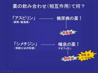 解熱鎮痛薬のアスピリンというお薬があります。 今はアスピリンは余り使われなくな りました。病院でアスピリンが使われるのは、少量を使うことによって、血液の流れをサラサラにする、血液凝固因子というか、血小板の凝集作用を抑える、血液の流れをサラサラにするための薬としてです。 解熱鎮痛として使う薬というとバッファリンという薬があります。 あれは、一定量使うことによって、熱や痛みを抑える。 この薬 と、糖尿病の薬をいっしょに、併用すると、糖尿病の薬が効きすぎて、下手をすると低血糖を起こすことがあります。 実際にはアスピリンは病院で使われることは殆どなく、少量のアスピリンだけ使われますのでそんなに気にする必要はありません。 ただ、もし気にするとすれば、後でのお話になりますが、市販のアスピリンと併用する場合です。 それから、胃酸の分泌を抑える薬、潰瘍の薬と、喘息の薬との併用で、喘息の薬の効果が効きすぎて手の振え、頭痛、吐き気が生じることがあります。 気管支を広げる薬の副作用が出やすくなります。 この薬は血液中の濃度を測りながら使わなければならない、治療域の狭い薬です。 先程の胃薬とワーファリンという薬、これは特に心臓の手術をされた方や、心筋梗塞の関係で心臓のバイパス手術、ふーせん、ステントで血管を拡げれた方で利用されます。 ワーファリンは血液凝固因子の作用を打ち消して、 血液の 流れをサラサラにする薬ですが、アスピリンと胃薬で作用が強くなり、出血を起こしたり、眼底出血をおこしたり、紫斑が出たりします。