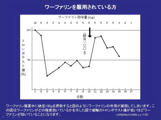 血ビタミンKは凝固因子の一つですが、ワーファリンが凝固因子を抑えるということは 、血液が固まり難くなる、サラサラになることです。栓を抑えるというワーファリンの作用は、梗塞を起こし易い方にとっては都合がよいわけです。 この効果がなくなると、血栓ができやすくなるので、本来効果として期待している効果が出なく、むしろ薬が効かなくて血栓症状が出てくるということになります。 納豆を食べるとワーファリンの作用が落ちますよということです。 納豆に中に入っているビタミンK、また、納豆がビタミンKを含むだけでなく、腸の中でビタミンKをたくさん産生しますので納豆を食べてから1週間前後ビタミンKを腸のなかで産生されます。 納豆を食べたその日だけでなく、ワーファリンを飲んでいる方は納豆を食べれません。納豆だけでなく他のものもあります。 後ほどご紹介します。 これは実際にワーファリンを服用している方が、納豆100g食べた時、このトロンボテストというのがあります。 これが上がると血液が固まり易くなります。下がるとサラサラに固まり難くなる。 納豆を食べると、急激に高くなります。 と言う事は、 血液が固まりやすくなるということを示しています。 くすりの効果が無くなってしまいます。 納豆や、クロレラや大麦若葉、は絶対服用しないこと。ビタミンKが多く含まれます。クロレラや大麦若葉というのは健康食品で、もちろん緑黄色野菜の不足する方には問題ないわけですが、ただ、ワーファリンをのんでいる方には薬の効果がなくなってしまいますので、摂らないようになさって下さい。食べ物の中でもブロッコリー、パセリ、春菊、小松菜などはビタミンKを沢山含んでいます。実は野菜だけでなく、緑茶の中、玄米茶とか普通の番茶は問題ないのですが、高級な煎茶、玉露の中にビタミンKが沢山含まれると言われています。