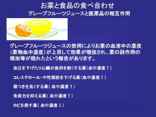 グレープフルーツジュースです。 グレープフルーツジュースで影響を受ける薬はいろいろあります。 睡眠を改善する薬、血圧を下げる薬、コレステロールを下げる薬、免疫を下げる薬など。