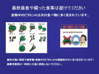 1日何杯も飲みワーファリンと言う薬を飲む方は気を付けて下さい。 食べ過ぎにはご注意。普通の緑黄色野菜など、このんで多く食べる方、ボールに一杯、1日に何杯も、極端な食べ方をする方は注意なさってください。