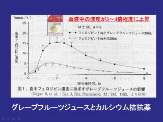 グレープフルーツジュースと一緒の飲んだ時のほうが2倍~3倍の血液中の濃度になっています。 高齢者の方で腎機能、肝機能の悪くなった方は若い人に比べ血液中の濃度が高くなるとお話ししましたが、それと同じように、年齢ではなく、飲み合わせの関係で、グレープフルーツジュースを飲用すると、こう濃度が高くなります。 グレープフルーツジュースは飲用したその時だけでなく、数日間にわたって影響を与えます。