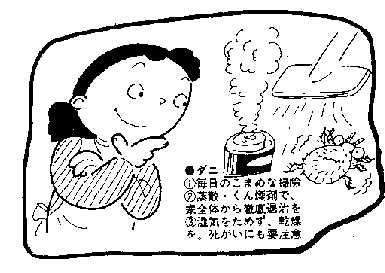 ダニ 1.毎日のこまめな掃除 2.薫散・くん煙で、家全体から徹底退治 3.湿気をためず、乾燥 4.死がいにも要注意