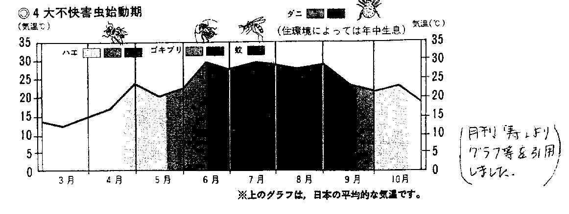 さわやかな新緑の季節を過ぎると気温も上昇し、湿度も高くなってきます。 高い湿度や温度を好むダニをはじめゴキブリやハエ、蚊などの不快害虫が発生する季節となりました。 蚊は20℃を超えると活動を開始し、4月を過ぎるとそろそろ出始めてまいります。 ゴキブリは18~34℃が最適な活動温度です。 ダニは住環境によっては年中生息します。 特に春から夏が活動時期となり、ジメジメした梅雨時から残暑の9月頃まで活動生息します。
