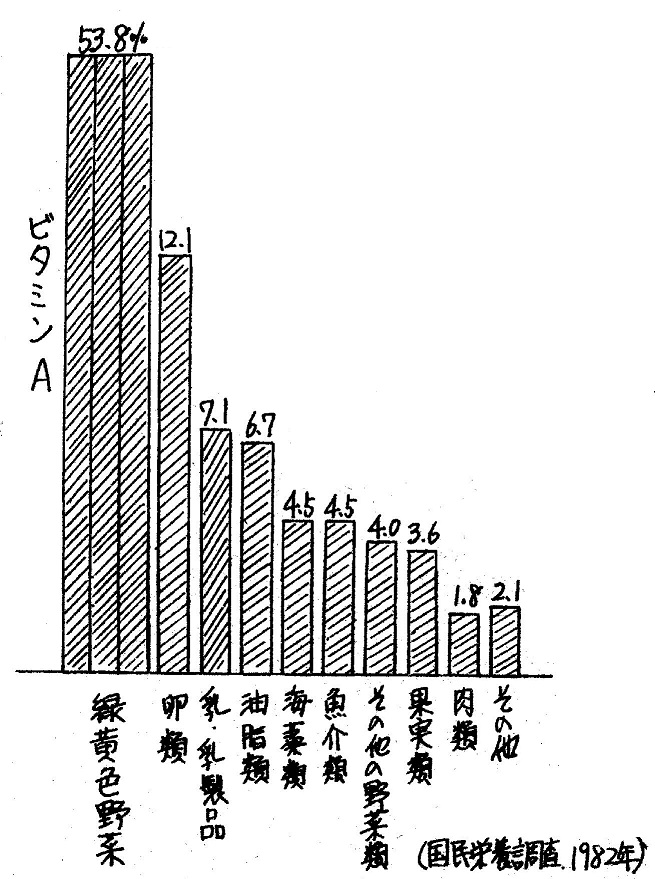 日常で我々がどのような食品からビタミンAを摂っているかを明らかにした栄養調査、この結果、緑黄色野菜が最も効率で卵類の4倍以上にもなります。