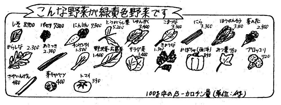 栄養学的には、「いくら野菜を多く摂っても、青い野菜を摂らなければ意味がない」と断言する人がいるほど緑黄色野菜の摂取が重要になっています。緑黄色野菜には、ビタミン・ミネラル類が沢山あるからです。さらに以外と知られていないのが緑黄色野菜は貴重なカルシウム源でもあるのです。