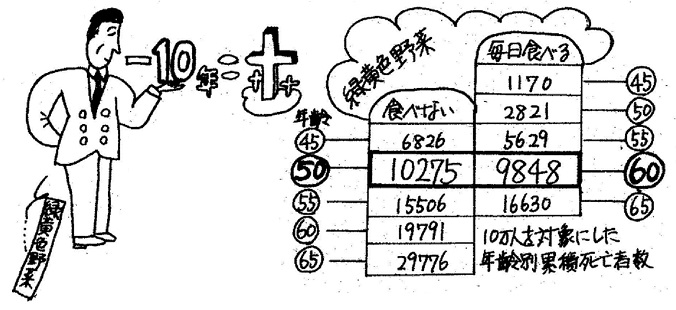 緑黄色野菜を食べない50歳の死亡者数は、毎日食べる60歳の死亡者数とほぼ同じです。老化、死亡年齢に10年も差がでます。