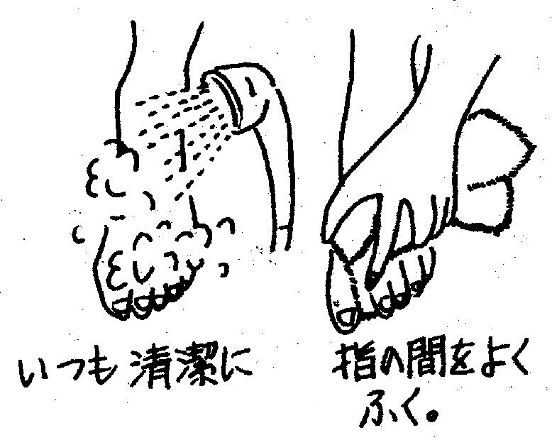 ②足は特に清潔に。乾燥に注意を払い、入浴後は指の間を良く拭く事。