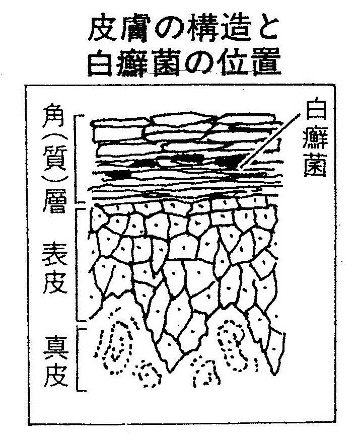 | 白癬菌は、角質を溶かしながら角質層に入り込んでいきます。治療をせずにほうっておくと、角質の奥深くに侵入してしまいます。そうなると治療が難しくなります。早めに、根気良く治療することが大切です。 |