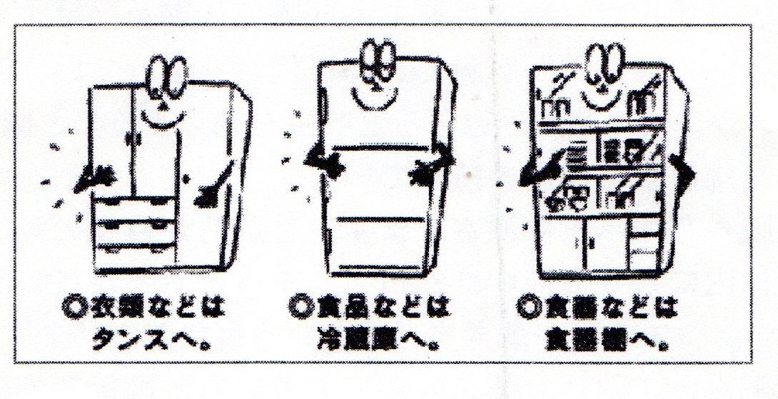 2.食品、食器、おもちゃ、寝具、衣類、貴金属、美術品、楽器、光学機器等は直接煙が触れない様に収納するか、ビニールシートや新聞紙でカバーをする、或いは部屋の外へ出して下さい。