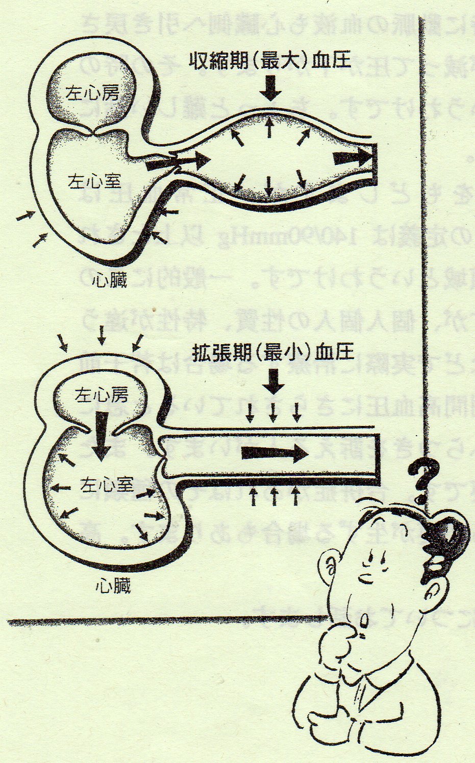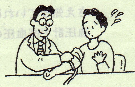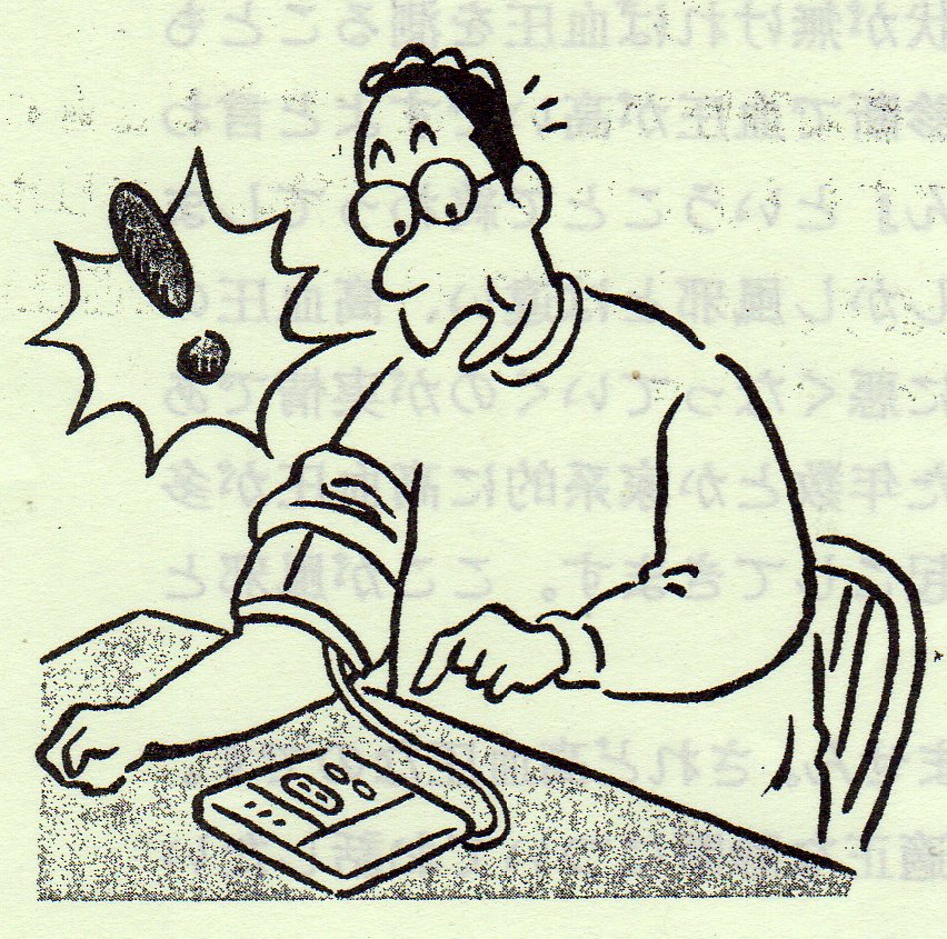 高血圧のお話し ~その2~ 前回御約束した様に血圧の正しい測り方と血圧の判断の仕方についてお話ししたいと思います。 血圧と言っても、その測定状況によって可也変動します。一日の内でも時間帯によって変動が見られます。運動すれば当然血圧は上昇しますし、興奮しても、緊張しても上昇します。緊張と言えば『家では高くないのに病院へ来ると高いんです。』と言われますが、これは白衣高血圧と呼ばれ、白衣姿を見ると緊張してしまうタイプの人に見られます。変動する事を念頭に置いて少しくらい上がったとか下がったとか騒がない事です。安定した値を得る為に大体一定の時間に測定して日々の変動を評価するべきです。本来は測定前に10分間位横になって安静にしておくべきですが、簡便的には測定する前に前身の力を抜いて5回位深呼吸をすると、人によっては30mmHg位下がります。 皆さん御存知の様に血圧を測った時には上の値と下の値がありますね。腕にマンシェットと言う帯を巻いて、そこに空気を送り込んで腕を締めていくとある値以上は血の流れが止まってしまいます。そこから段々緩めていくと音が聞こえ始める所つまり血が流れ始める所があり、この値が上の血圧つまり収縮期血圧と言います。そこから更に下げていくと再び音が聞こえなくなる所があり、この値が下の血圧つまり拡張期血圧と言います。少し難しい話になりますが、心臓は収縮と拡張を繰り返して全身に綺麗な血液を送り、又全身から汚れた血液を回収しています。つまり心臓は血液のポンプの役目をしています。心臓が収縮して血液を全身に送りだすと動脈に勢い良く血液が流れ込み、その時の血管の圧が収縮期血圧で、心臓が拡張して全身の静脈から血液が戻りますが、その時に動脈の血液も心臓側へ引き戻される為に動脈内の血液量が減って圧が下がります。その時の血管の圧が拡張期血圧と言う訳です。ちょっと難しい話になってしまったでしょうか。