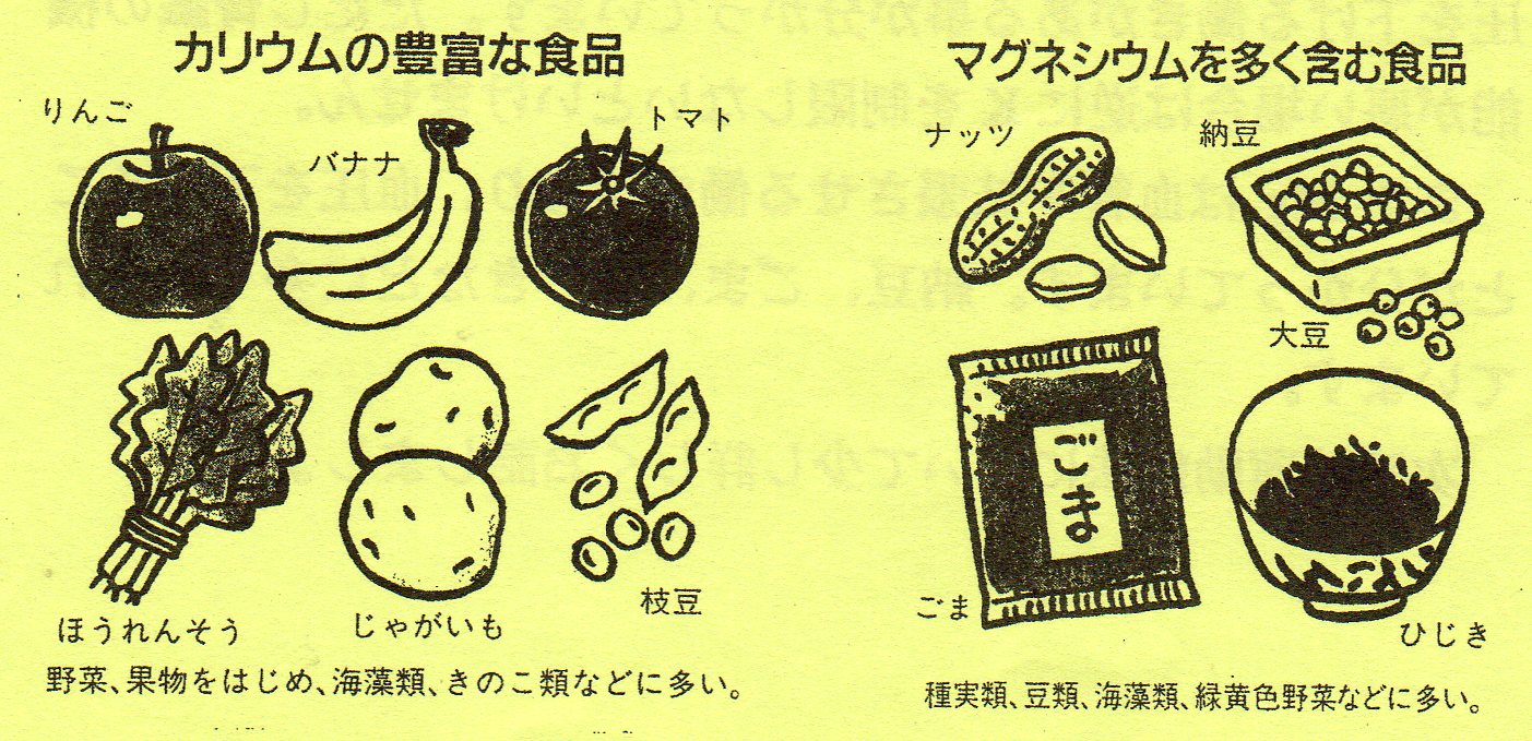 普通の人は1日10g以上の塩分を取っていると考えられます。しかし高血圧があれば1日7g以下に抑える必要があります。(アメリカでは5g以下ですよ)10g以上取っていた人が急に7g以下と言われても『とても出来ません!』と言う声が聞こえそうですが何事も慣れの問題です。ただ急に減らすよりは徐々に減らしていった方が良いと思います。又コショーやトウガラシや酢で代用するのも一つの方法です。 塩分制限以外にどんな事に気をつければ良いでしょうか? 前回お話した生活習慣病と言うのを覚えていると思います。 特に肥満を伴っている場合は体重をコントロールする事で血圧が下がる事が分かっています。つまり1日の摂取カロリーを制限する事が重要となります。糖尿病と同じですね。 どの程度制限するかは肥満の程度によります。 それ以外ではなるべく摂取するように言われているのがカリウム(K)とマグネシウム(Mg)でしょうか。 Kは野菜や果物に豊富に含まれており、塩分に対抗して血圧を下げる働きがある事が分かっています。但し腎臓の機能が悪い場合は逆にKを制限しないといけません。