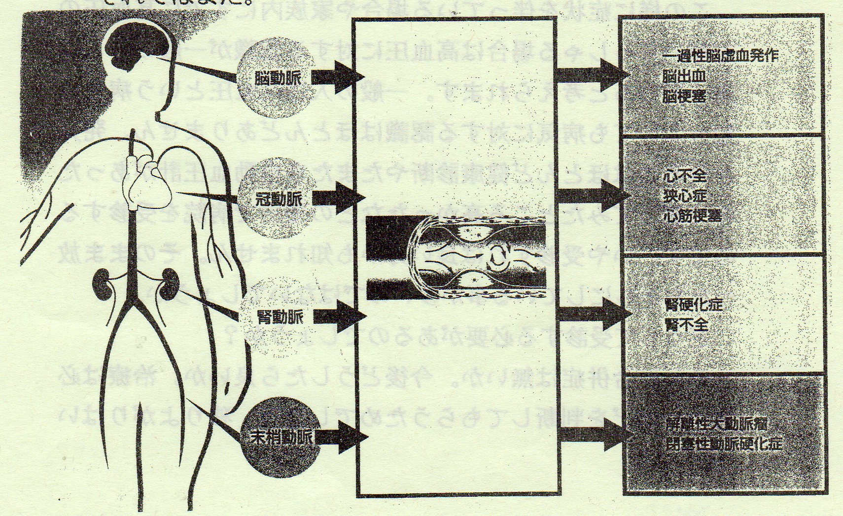 お待たせしました。前置きが長くなりました。『早く本題に入れよ』と言う声が聞こえてきそうです。 さて高血圧症の合併症にはどんなものがあるのでしょう。 高血圧は全身の動脈に影響を与えます。その結果、脳(高血圧性脳症、脳出血、脳梗塞)、心臓(高血圧性心臓病、心不全)、腎臓(腎不全)、動脈(解離性動脈瘤)に合併症をきたすのです。又これらの重要な動脈では高血圧にさらされることによって血管内にある内皮細胞と言う重要な細胞を障害する結果、動脈硬化(粥状硬化)の原因となります。その結果、脳梗塞、心筋梗塞、狭心症、大動脈瘤、閉塞性動脈硬化症等の疾患もきたす事となります。 夫々病名だけでは聞いたことがあってもどういうものかよく分からないと思いますので、夫々の合併症について説明を加えたいと思います。 ああ、しかしもう紙面が無くなってしまいました。 残念ですが続きは次回にお話しする事とします。