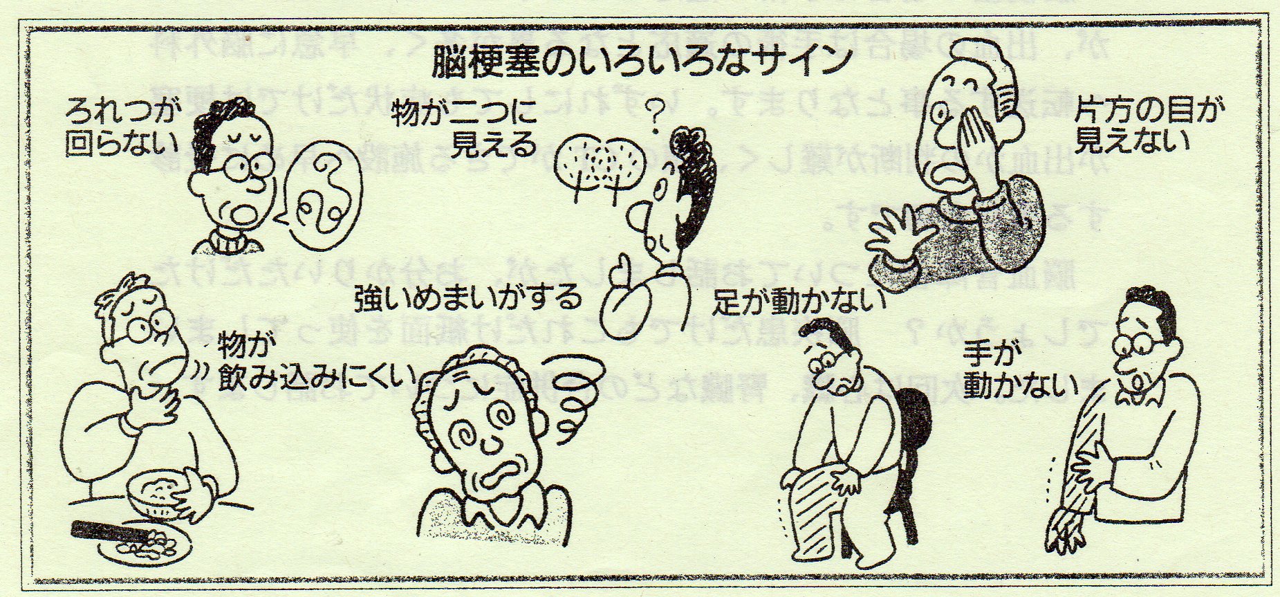 一方、動脈硬化(粥上硬化)が原因と考えられる脳梗塞は比較的な大きな動脈に起こり、動脈硬化で狭くなった血管に突然血栓がつまり、突然意識が無くなったり、片方の手足が動かなくなったり、言葉が出なくなったりします。これが脳血栓です。血栓がつまっても直ぐに流れれば症状は一時的で回復しますが、つまったままで流れないと症状が固定するか又は進行して、結局脳梗塞になります。これは最初説明したラクナ梗塞よりも太い血管で起こり、ダメになる脳も広範囲となる為に症状も重篤で、重症な場合は寝たきりとなったり、命も危ない状況となります。 脳梗塞の場合は手術の適応となる事は殆どありませんが出血の場合は手術の適応となる事が多く、早急に脳外科へ転送する事となりますいずれにしても症状だけでは梗塞か出血かの判断が難しく、頭のCTが出来る施設へ早めに受診する事が大切です。 脳血管障害についてお話しましたが、お分かり頂けたでしょうか?脳疾患だけでもこれだけ紙面を使ってしまいました。次回は心臓、腎臓等の合併症についてお話します。